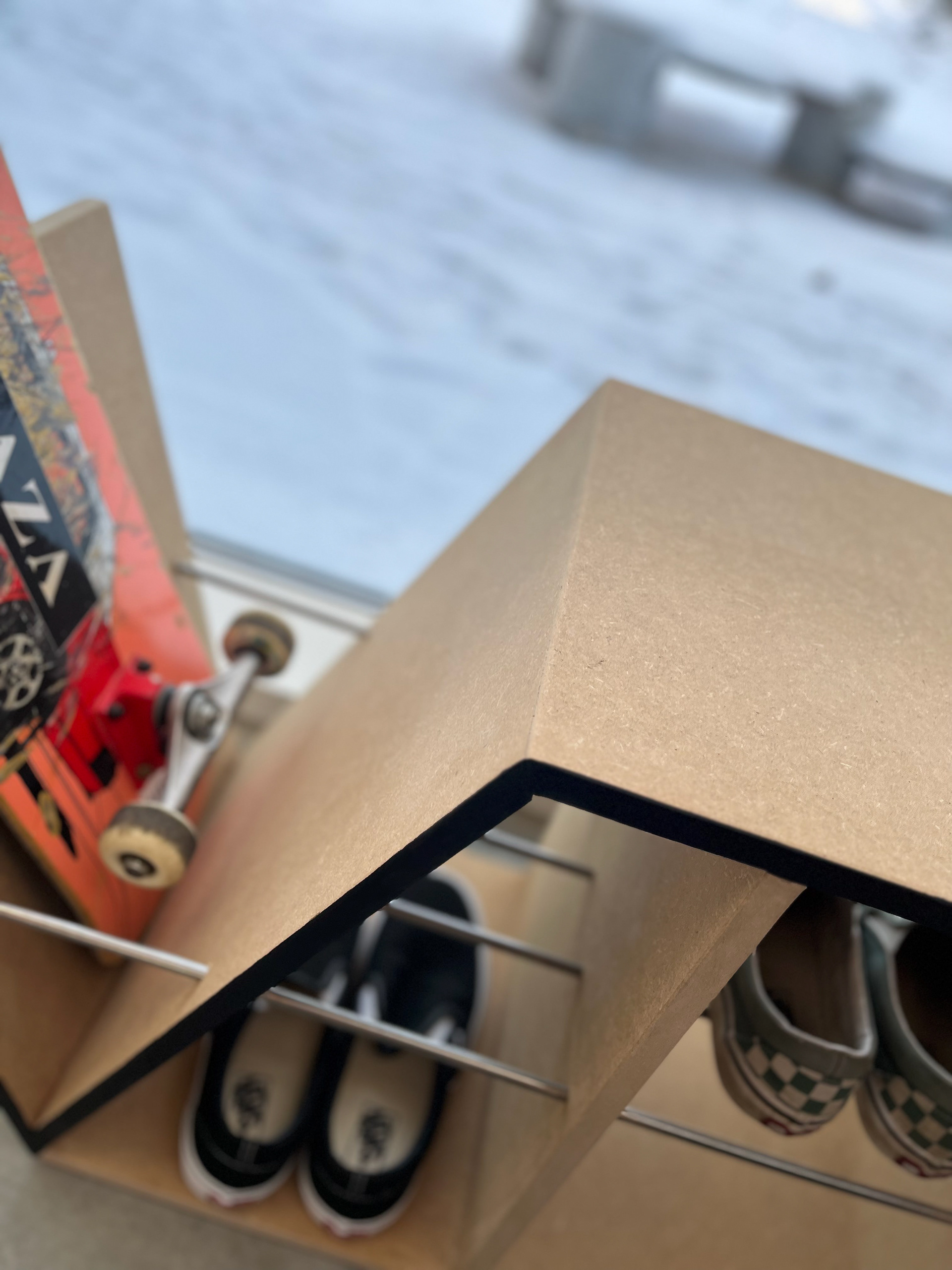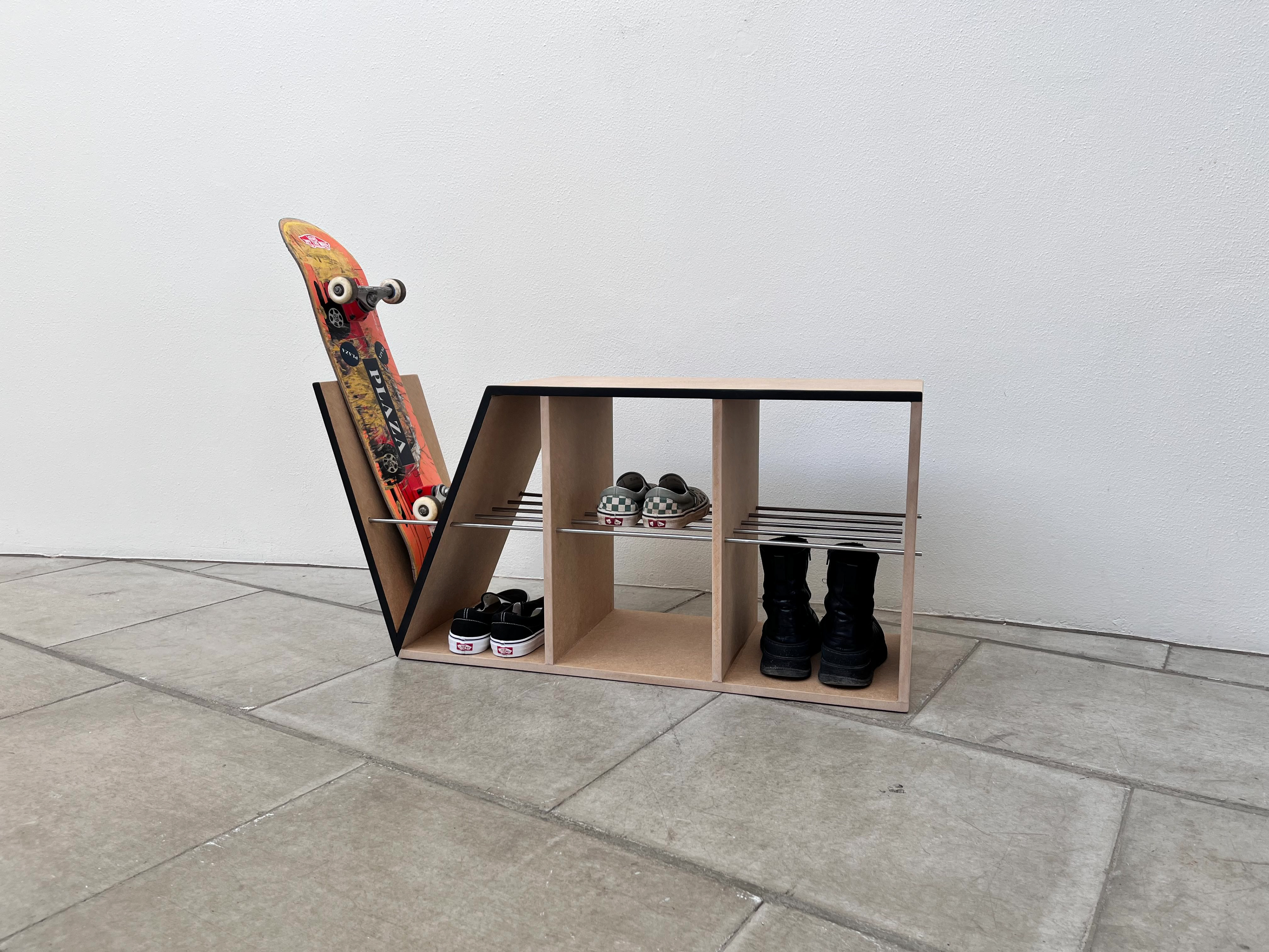 Møblet kan bruges til opbevaring af sko, skateudstyr samt skateboards - men også som siddeplads i entreen.